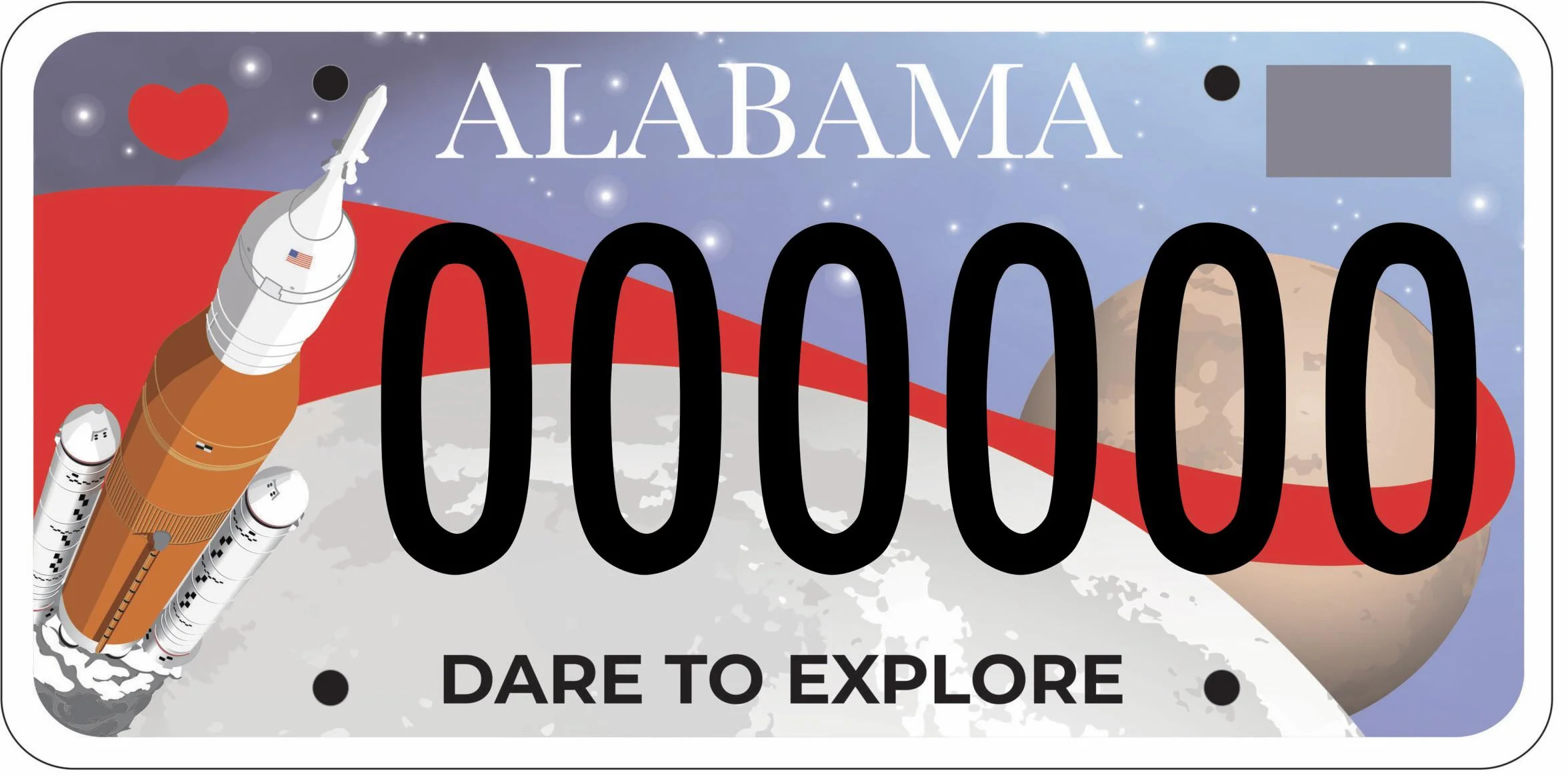 The Alabama Space Tag features the Space Launch System set against both the moon and Mars. A red ribbon extends between the two in a design similar to the logo of NASA’s Artemis program, under which the SLS will fly.